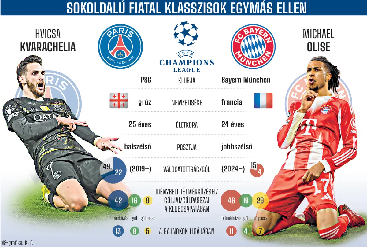 Az is lehet, hogy Vitinha is vállalja a játékot. A PSG portugál karmestere április 19-én, a francia liga 29. fordulójában a Lyon elleni hazai mérkőzésen sérült meg, és kihagyta a következő két bajnokit a Nantes és az Angers ellen. Távollétében Luis Enrique vezetőedző átalakított középpályástriót választott: Dro Fernández, Lucas Beraldo és Joao Neves szerepelt a Nantes, majd Senny Mayulu, Fabián Ruiz és Beraldo az Angers ellen. Vitinha napok óta a csapattal edz, így számíthat rá a szakmai stáb. A portugál középpályás ebben a BL-sorozatban mind a tizennégy találkozón pályára lépett, hat gólt szerzett és adott egy gólpasszt is – alapembere a címvédőnek. A L’Équipe sportlap szerint a Szafonov – Hakimi, Marquinhos, Pacho, Nuno Mendes – Vitinha, Zaire-Emery, Neves – Doué, Dembélé, Kvarachelia összeállításban veheti majd fel a küzdelmet a Bayern ellen. Fabián Ruiz is bevethető, a szintén nem teljesen egészséges Asraf Hakimit viszont egyenesen a kezdőbe várja a tekintélyes sportlap.