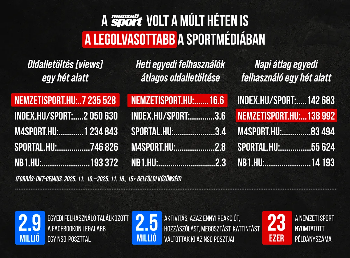 A 2025-ös év 46. naptári hetében is a Nemzeti Sport Online volt a magyar sportrajongók legolvasottabb honlapja. A november 10-től november 16-ig tartó időszakban több mint 7.2 millió oldalt töltöttek le felhasználóink. A Nemzeti Sport a közösségi médiában is népszerű, több mint 2.9 millió felhasználó találkozott a posztjainkkal. (a múlt hónap átlagos napi nyomtatott példányszáma 23 373).