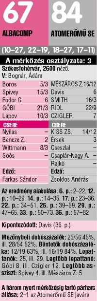 A székesfehérvári drukkerhad legnagyobb bánatára az ellen a folytatásban is ipari tempóban szórta a triplákat, ez pedig azt jelentette, hogy az Albacompnak esélye sem volt a felzárkózásra. Sőt, újra ötödik sebességbe kapcsolt, és szakadéknyivá változtatta a különbséget a Zsoldos-kompánia. A cserepadról indulva is megbízható Kiss berámolt két hárompontost, Ridl élvezte a gála-előadást, Smith sorra nyerte meg a párharcokat, vagyis szárnyalt az Atom. Eközben odaát összeomlani látszott egy hónapok alatt felépített remekmű. Úgy tetszett, Borosék képtelenek megbirkózni a sérülések (Walker mellett Fodor és Bencze sincs tökéletes állapotban) jelentette akadályokkal, és erre tökéletesen ráérzett az ASE.